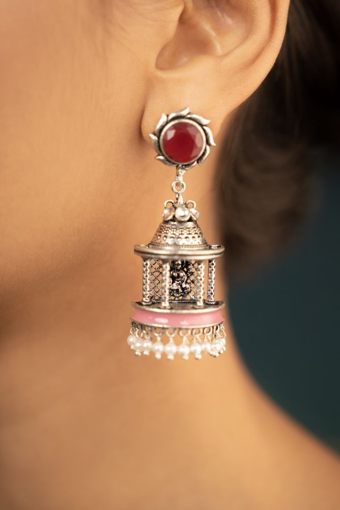 Oxidized silver jhumkas inspired by the divine essence of Indian culture and with a lady in silver at its center. Its antique charm is perfect for honoring traditional attire and adding cultural depth to contemporary styles.