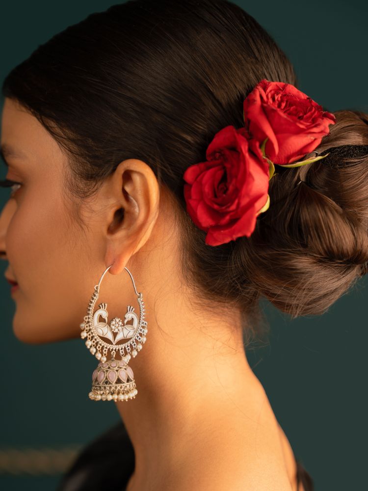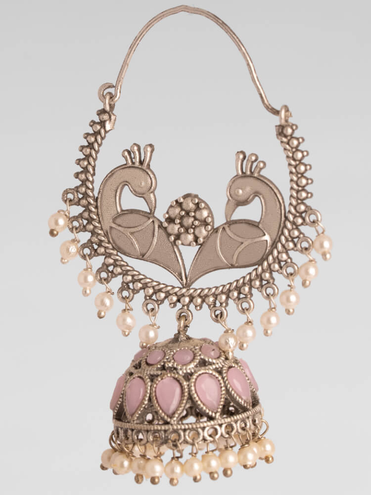 Take your desi look to another level with our oxidized silver earrings, featuring two intricately designed peacocks. The mirror like symmetry makes it a perfect accessory for traditional and boho looks.