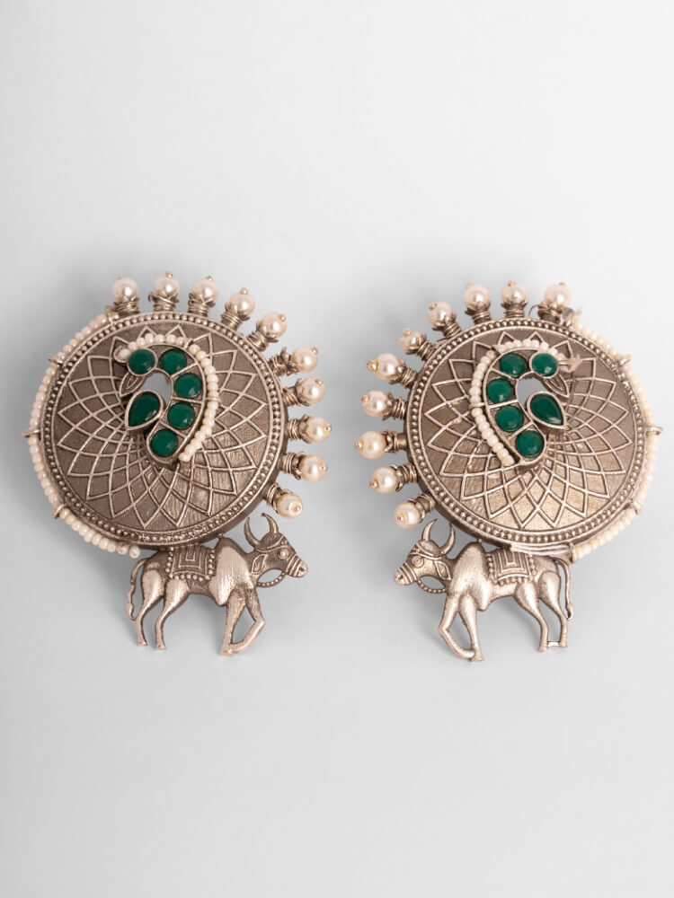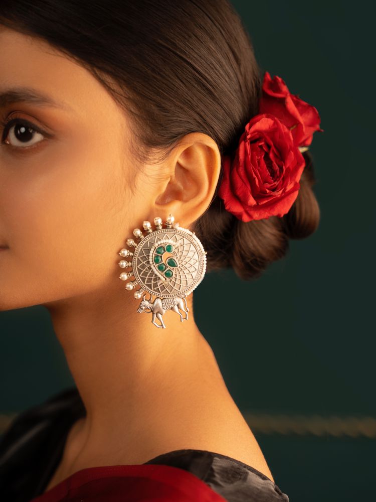 Embrace the beauty of elegantly crafted silver oxidised earring with a beautiful peacock motif adorned on it. The intricate details on it enhances its vintage charm, hence make it a great addition to your collection.
